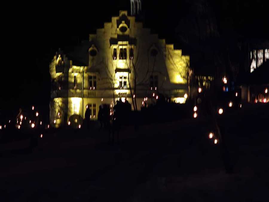 Der Weg entlang der oberen Schlossmauer führte unter den verschneiten hohen Bäumen mit ihren frostigen Zauberästen zu der von Susanne Zuda in großen, beleuchteten Bildern gestalteten